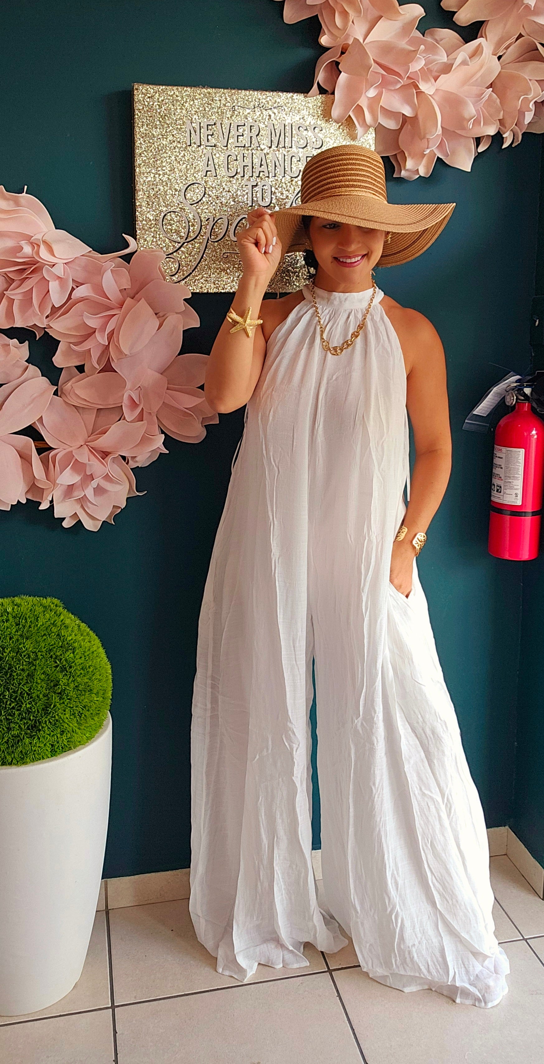 Step into confidence with this playful white woven halter jumpsuit. Designed to be fully opaque, it keeps you stylish without any worries. The halter neckline adds a flirty touch, making it perfect for sunny days or lively nights. Embrace your unstoppable spirit in a look that’s as bold and fun as you are! Only in white color.