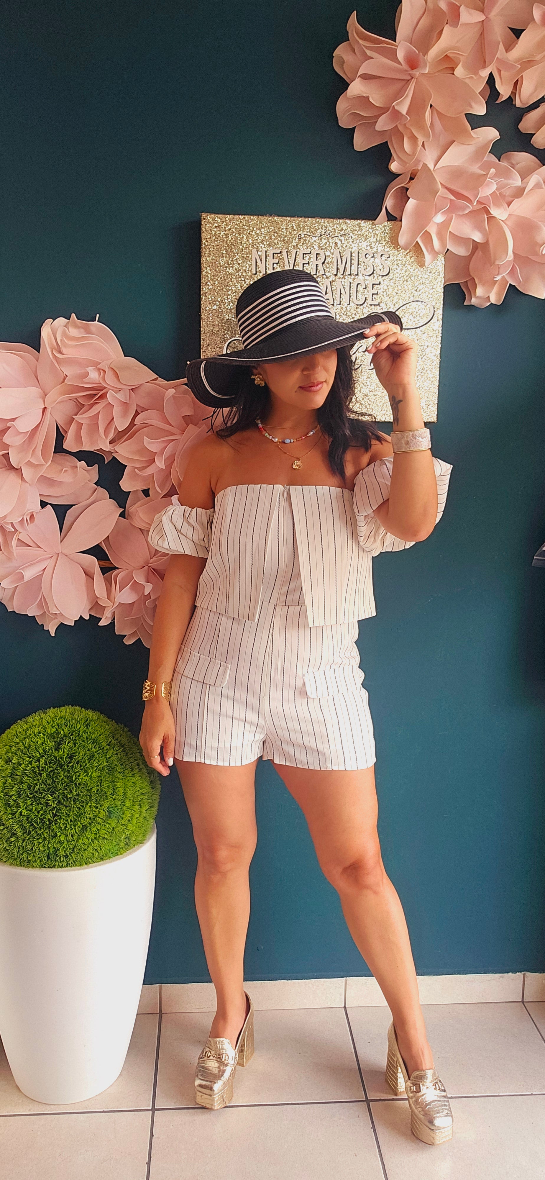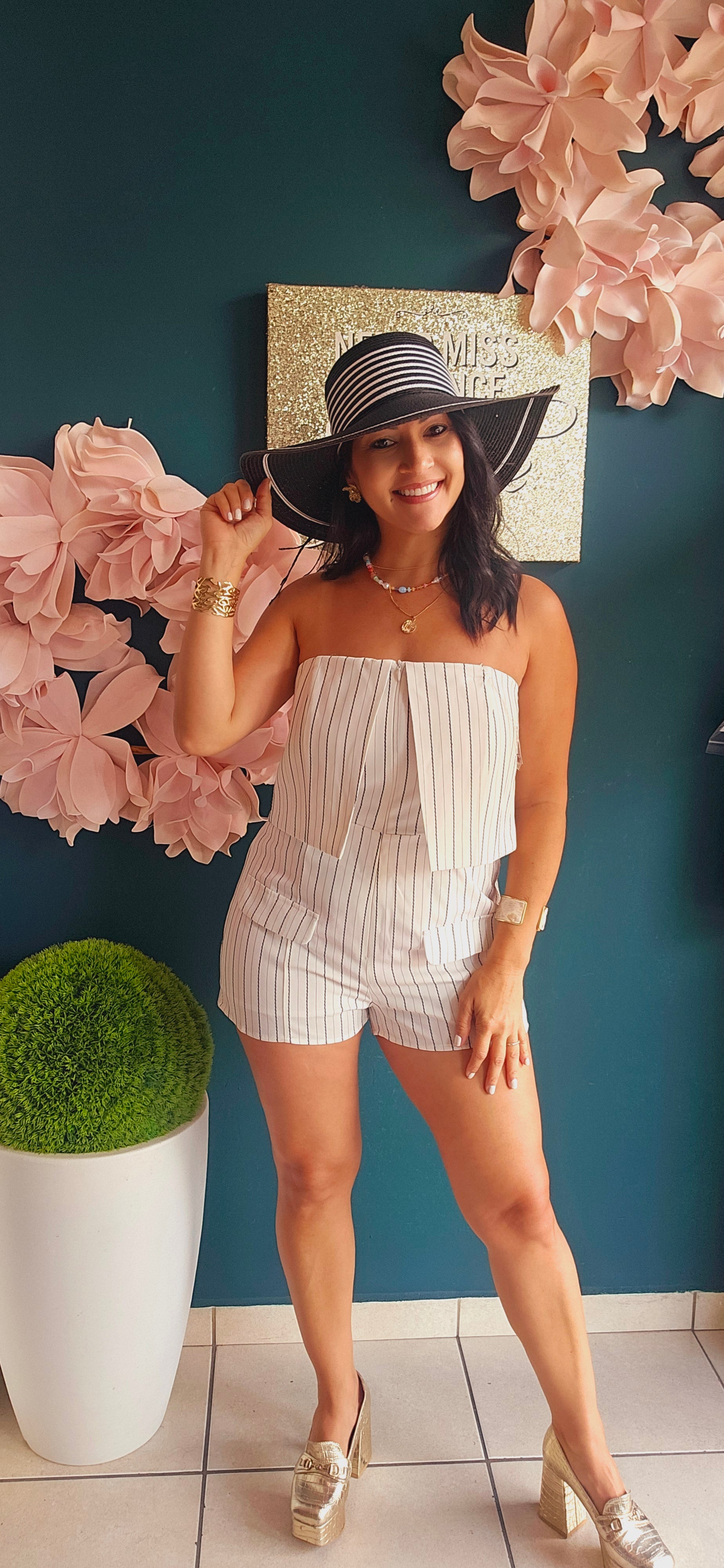 This black and white strapless romper brings a fun twist to your wardrobe with its sleek design and versatile removable sleeve. Perfect for mixing and matching your style, it lets you switch from chic sleeveless to a playful one-sleeve look in seconds. Ideal for sunny days or evening outings, it combines comfort and flair effortlessly.